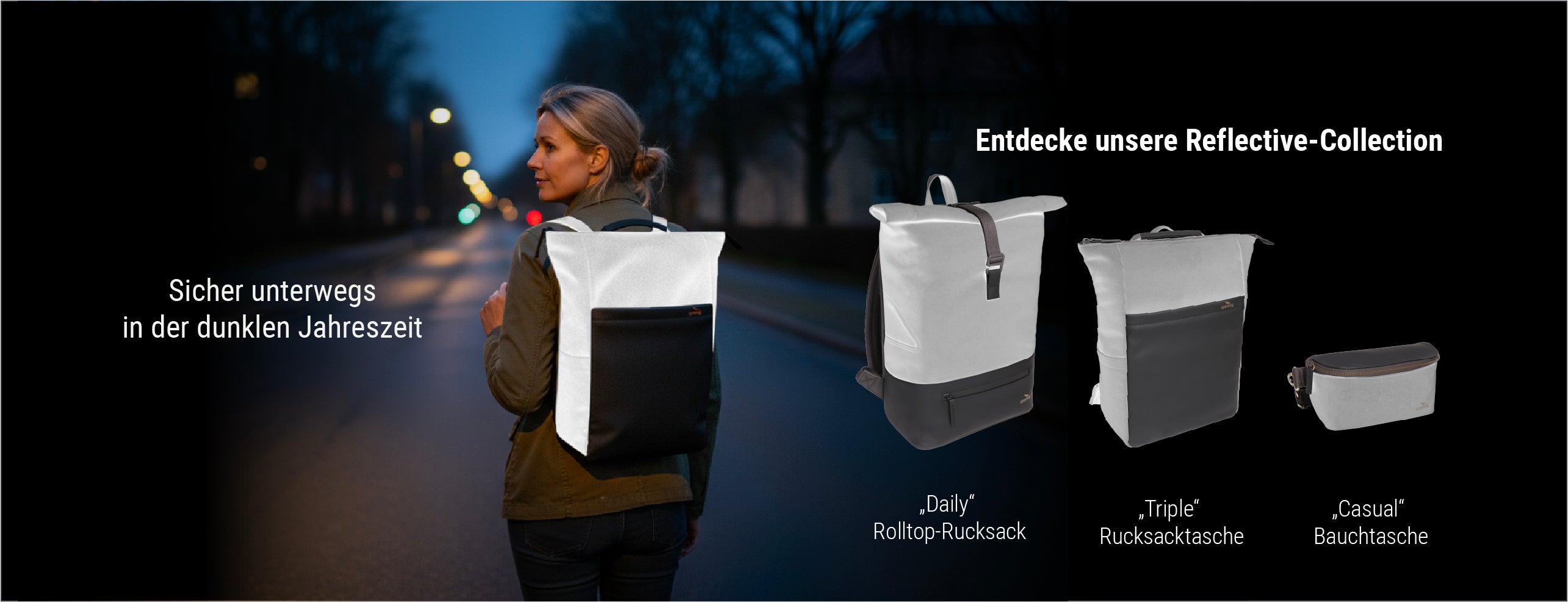 Unsere Reflectives sind keine gelbe Warnweste, die man dann doch nicht gerne trägt. Auf den ersten Blick sehen sie aus, wie ganz normale Rucksäcke und entfalten in der Dunkelheit dann ihre Superpower!
